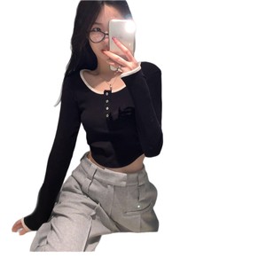 纯欲风圆领单排扣长袖T恤女辣妹紧身短款上衣拼色春秋冬打底衫ins