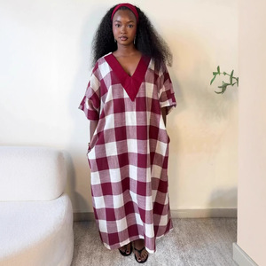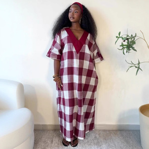 欧美外贸格子中长款连衣裙女非洲时尚气质V领短袖大码女装长裙子