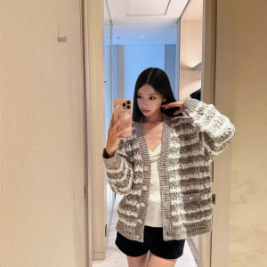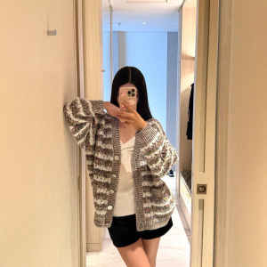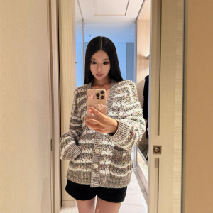 2025早秋新款南油cha韩系慵懒风休闲百搭条纹撞色V领长袖针织开衫