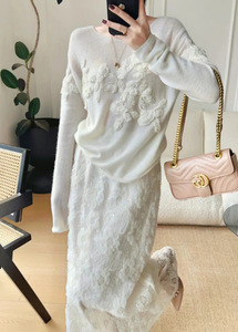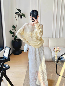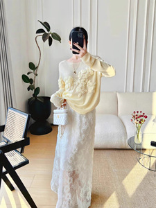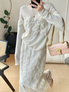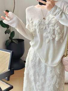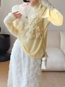 南油原创设计秋冬新款法式慵懒风立体绣花毛衣女时尚宽松圆领上衣