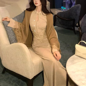 气质法式新中式巨好看的早秋连衣裙立领刺绣针织长裙开衫外套女潮