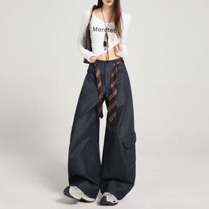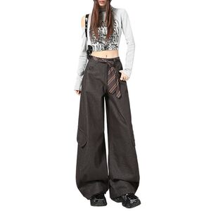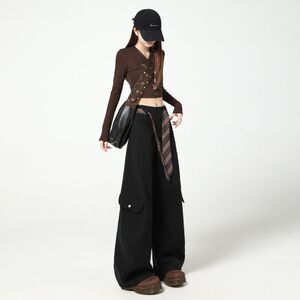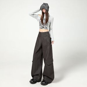 实拍秋季新款美式复古宽松弯刀阔腿工装裤女高腰休闲百搭长裤子