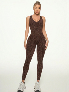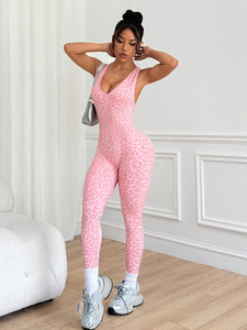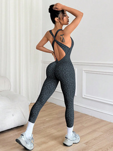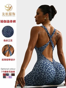 欧美跨境新款豹纹印花交叉纽带无缝连体瑜伽服女健身运动休闲外穿