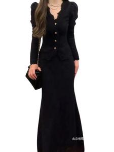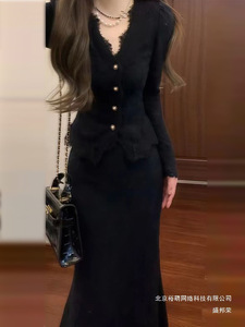 厂家直销法式黑色针织连衣裙子女秋装2025新款小个子香风一整套早