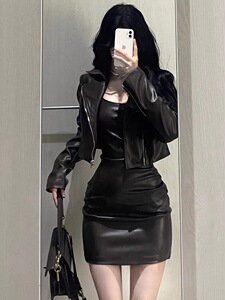 套装女2025秋季新款辣妹短款皮衣外套夹克吊带连衣裙显瘦包臀裙潮