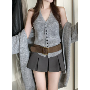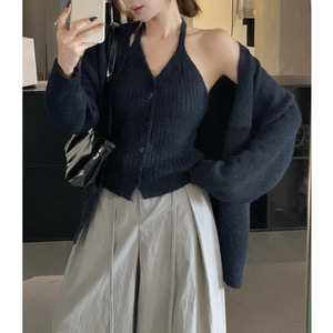 法式慵懒风气质针织开衫外套+气质单排扣挂脖针织吊带背心两件套