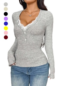 工厂现货V领蕾丝长袖针织打底衫秋季高级感修身内搭毛衣上衣跨境