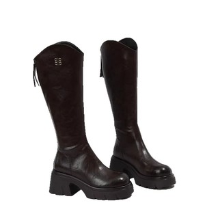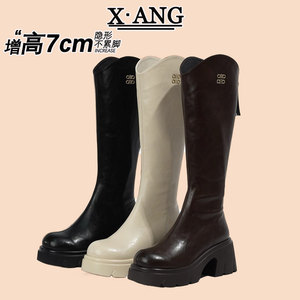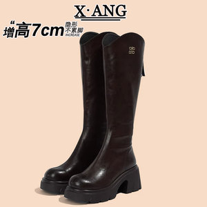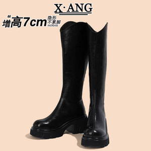 牛皮版粗跟V口高跟长筒靴小个子厚底增高不过膝高筒靴子女骑士靴