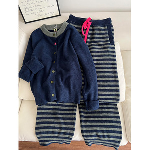慵懒风撞色半边绒睡衣女冬款大码加绒加厚针织保暖家居服套装秋冬