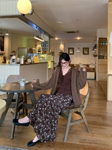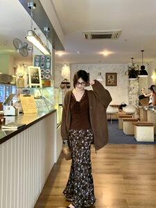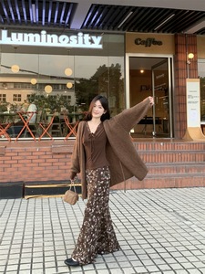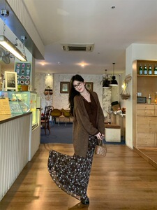 慵懒风韩版宽松毛衣女装新款纯欲气质收腰V领上衣碎花半身裙套装