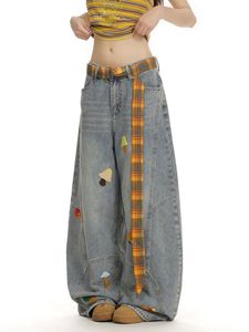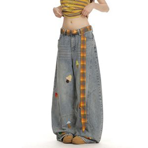 送腰带美式复古卡通刺绣弯刀牛仔裤女高腰款式百搭显瘦设计感阔腿