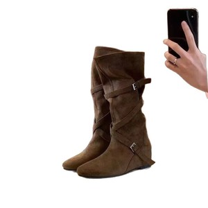 羊皮版~增高6cm真皮圆头显瘦中筒靴女秋冬新款柔软褶皱长筒堆堆靴