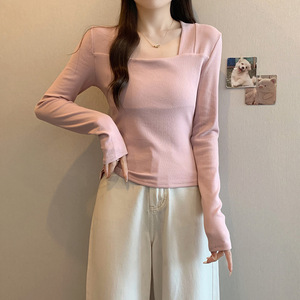 2025秋季新款胖mm大码女韩版休闲修身显瘦方领长袖T恤打底衫上衣