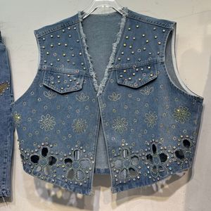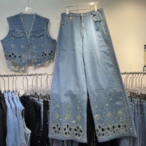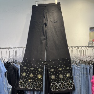 设计感黑色钉珠牛仔套装女花朵烫钻马甲 + 阔腿裤两件套大码显瘦