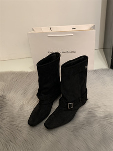 复古绒面卡其色短筒靴女靴子法式靴秋季小众设计西部堆堆靴骑士靴