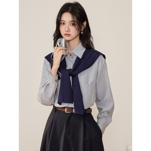 2025秋冬新款韩系学院风通勤气质条纹宽松长袖衬衫+披肩两件套女