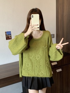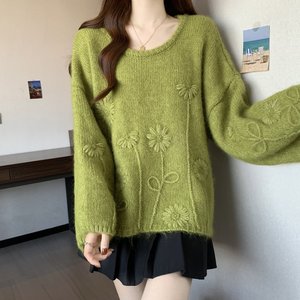 重工立体花朵刺绣套头毛衣女2025秋冬新款韩版宽松休闲针织上衣厚