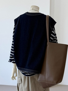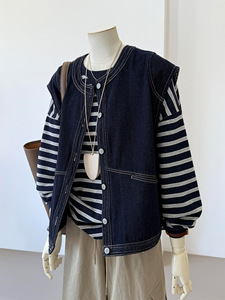 CHAO级推荐!秋天顶配~韩版藏青色圆领明线无袖牛仔马甲背心女秋