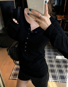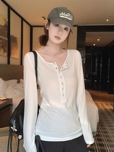 韩系半扣设计纯色修身长袖T恤女2025秋季新款气质显瘦百搭打底衫