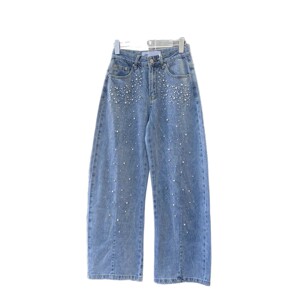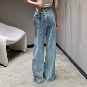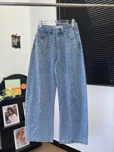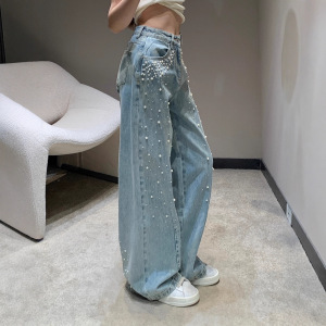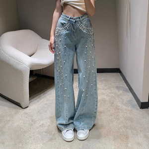 2025秋冬新款做旧浅色钉钻珍珠休闲高腰阔腿拖地百搭牛仔弯刀裤