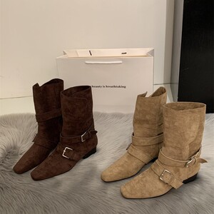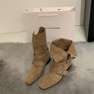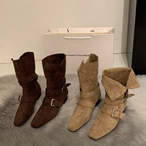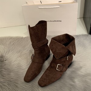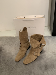 靴子女新款秋冬季复古方头绒面短靴女粗跟宽筒靴可折翻棕色西部靴