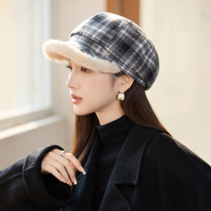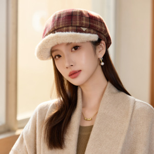 秋冬季帽子女气质复古格子条纹八角帽经典百搭毛绒保暖加厚画家帽