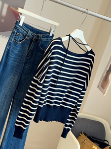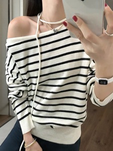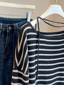 斜肩条纹长袖针织衫上衣女2025春秋新款设计感系带宽松百搭薄上衣