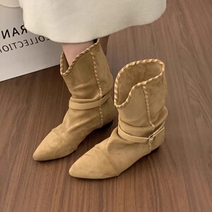 复古磨砂皮尖头褶皱堆堆靴子2025新款单靴内增高短筒西部牛仔靴女