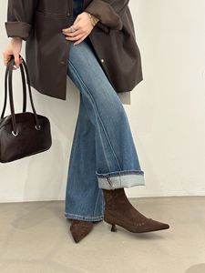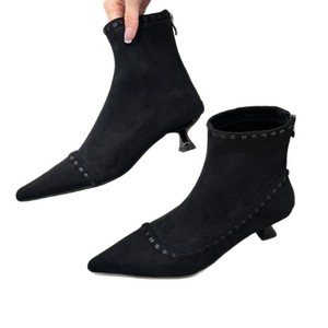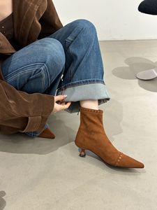 跟高3CM~小众设计斜边编织短靴女2025秋冬复古绒面尖头猫跟瘦瘦靴