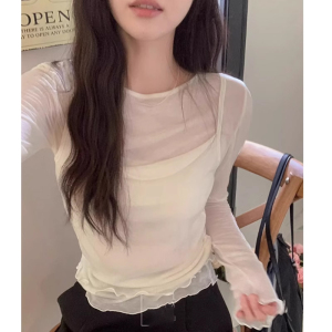 莱赛尔天丝白色罩衫女秋季2025新款长袖t恤假两件打底衫修身上衣