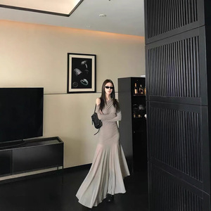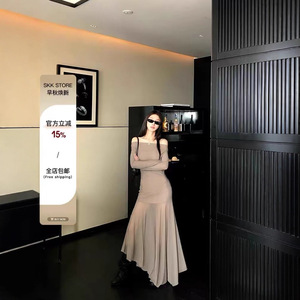 Skk Store jennie同款Lem*风弹力微透不规则修身长袖连衣裙女秋夏