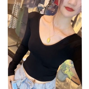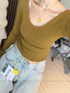 纯欲风正肩V领长袖T恤女2025早秋新款内搭洋气上衣显瘦紧身打底衫