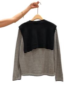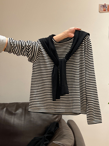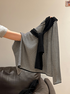 韩系黑白撞色条纹圆领披肩针织打底衫长袖T恤女早秋穿搭宽松上衣1