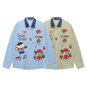 美式复古可爱汉堡小狗刺绣格子长袖衬衫男女秋季宽松休闲情侣衬衣
