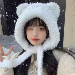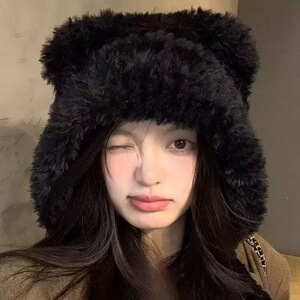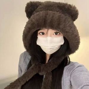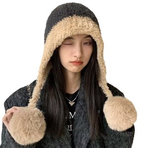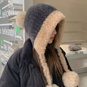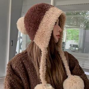 冬季防寒帽大头围毛绒挂球可爱护耳帽子女遮耳加绒加厚拼色户外帽
