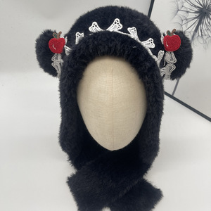 冬季加厚毛茸茸熊耳朵包头帽2025年新款苹果蕾丝边连围巾护耳帽子
