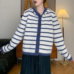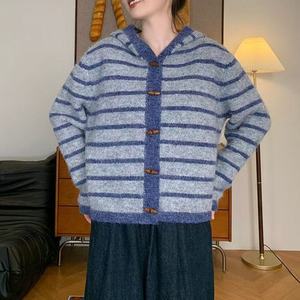 外贸新款条纹连帽牛角扣长袖长驼毛针织开衫复古简约毛衣外套女