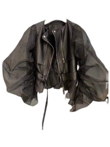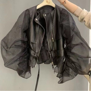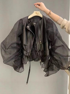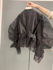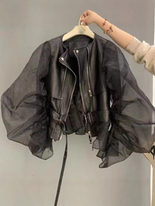 买手店专柜检漏bi入~短外套女欧根纱泡泡袖荷叶边时尚皮衣秋 大码