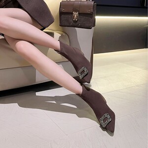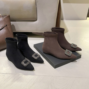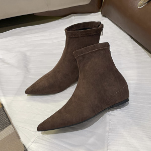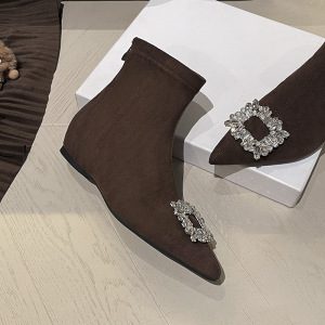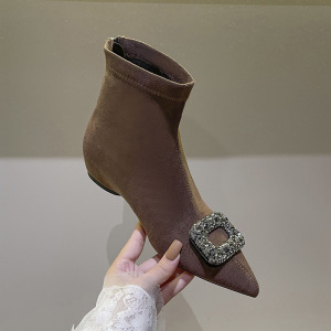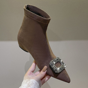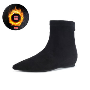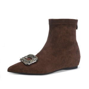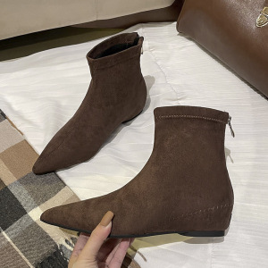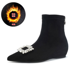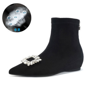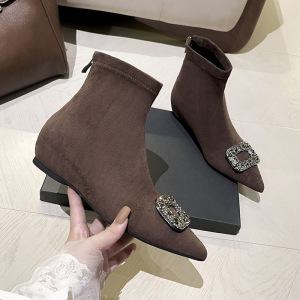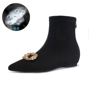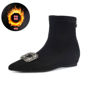 内增高短靴女秋冬新款尖头时尚水钻扣法式平底后拉链短筒瘦瘦靴子
