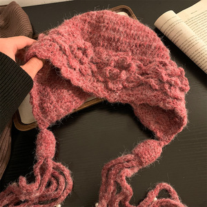 立体花朵手工针织帽女秋冬韩系显脸小珍珠流苏毛线帽保暖包头帽子