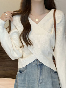 不规则交叉v领套头毛衣女秋季内搭宽松慵懒短款针织衫设计感上衣