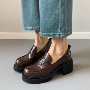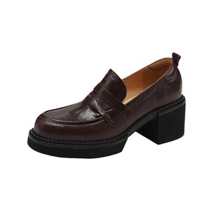 羊皮版~真皮厚底粗跟乐福鞋女复古风小个子增高一脚蹬简约小皮鞋