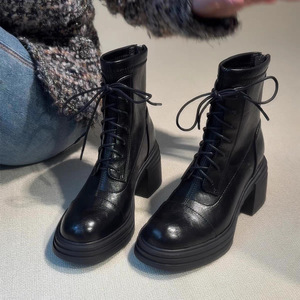 法式复古风圆头粗跟短靴女2025年新款百搭时尚瘦瘦靴后拉链马丁靴