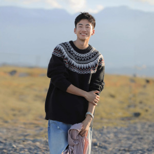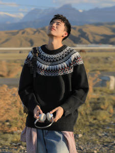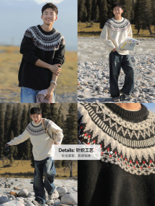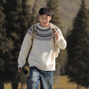 冬季美式复古慵懒风提花针织衫高级感情侣外套费尔岛圆领套头毛衣