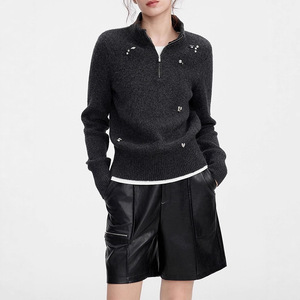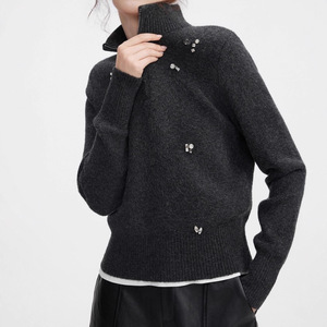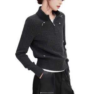 ELLE深灰色钉钻绵羊毛立领针织衫2025秋季新款高级气质时尚毛衫