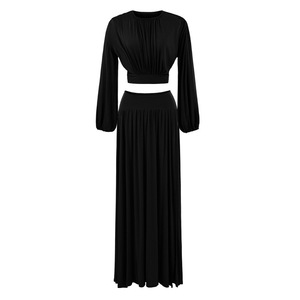 辣妹风套装女2025秋款蝙蝠袖圆领收腰长袖T+高腰抽褶垂感开叉长裙