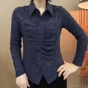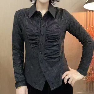 一件代发直播爆款2025秋季新款时尚翻领暗纹提花抽褶不规则打底衫
