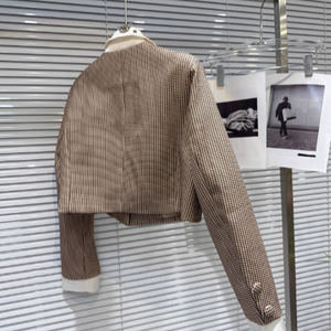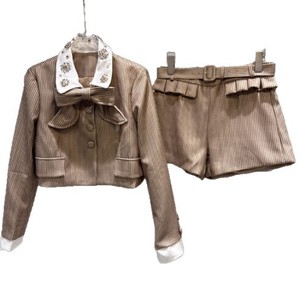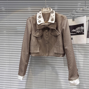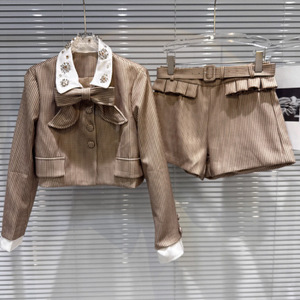 2025秋季新款小香风蝴蝶结领巾格纹短外套+腰带短裤套装