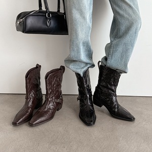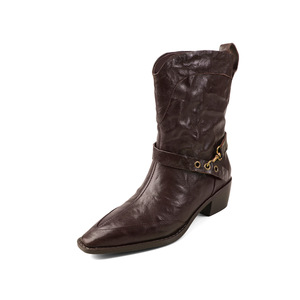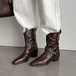 2025秋冬轻奢小羊皮欧货一脚蹬粗跟短靴女骑士靴方头法式牛仔裸靴