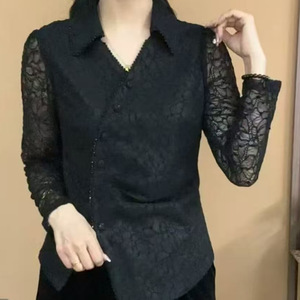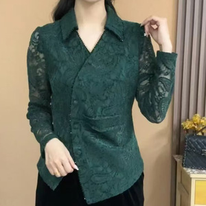一件代发抖音直播爆款2025秋季新款时尚洋气翻领蕾丝纯色长袖上衣
